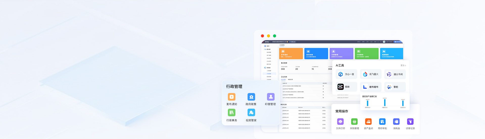 行政管理系統涵蓋信息發布、政策導航、行政事務、資產管理、運營分析等功能,同時推出智能印章、視頻管家等智能硬件,軟硬件結合,提升企業管理效率、為企業實現降本增效。